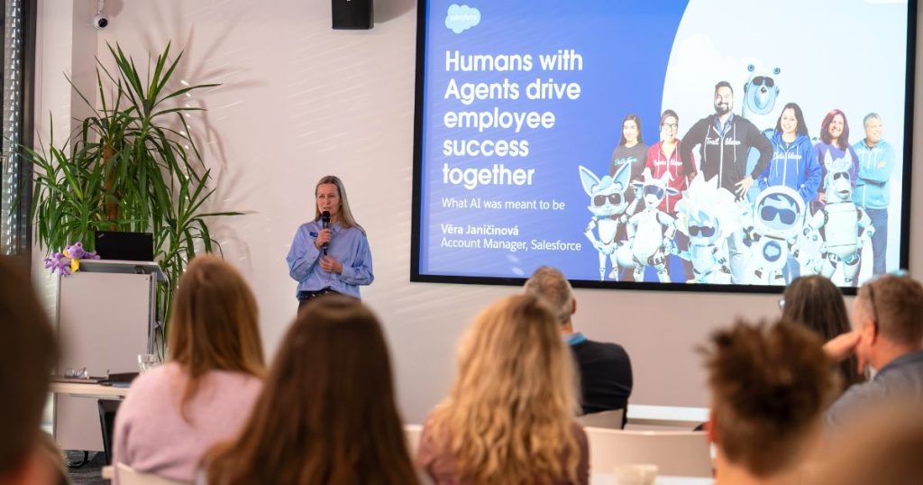 Věra demonstrated how Salesforce applies these capabilities internally, where AI agents help employees quickly resolve HR questions, access policies, and receive personalised support directly within tools such as Slack, significantly improving employee experience while reducing the operational burden on HR teams.
